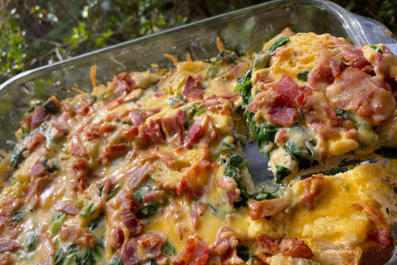 Celebrate the start of Spring with a strata made out of fresh spinach, bacon, scallions, multiple cheeses and some cream.