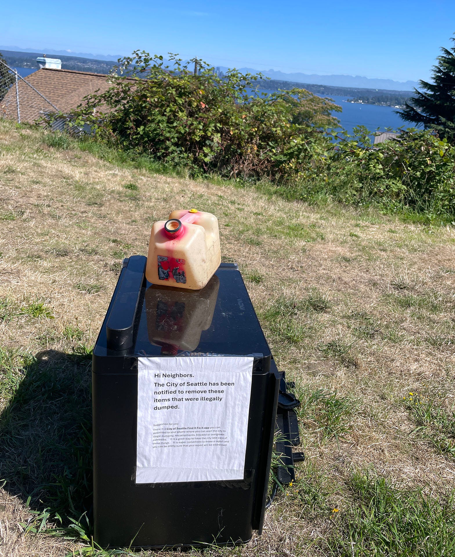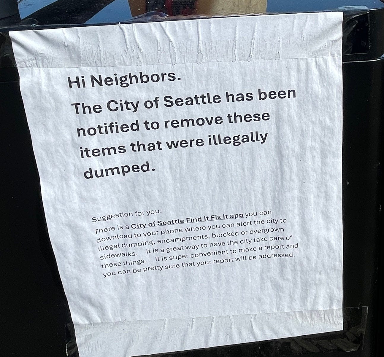 A neighbor attached a helpful note about Seattle’s find it fix it app, where you can snitch on homeless people and or report illegal dumping. “You can be pretty sure your report will be addressed.”